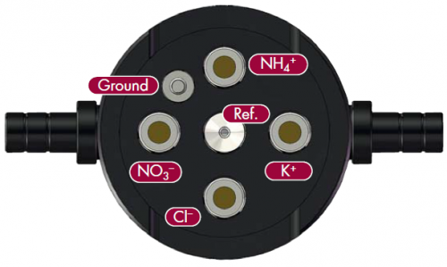 Hlavní iontově selektivní elektrody (dále ISE) pro sledování NH4+ a NO3- jsou umístěny vedle sekundárních ISE pro sledování koncentrace Cl- a K+ iontů. Tyto vedlejší elektrody mají za úkol odfiltrovat největší rušení a umožnit přístroji správně vyhodnotit koncentrace měřené pomocí hlavních ISE.