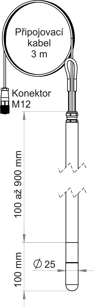 The TMS11A soil tensiometr has a diameter of 25 mm and is available in various lengths from 20 to 100 cm. The upper end of the tensiometer is terminated by a cable gland, through which a 3 m long communication cable is led out of the sensor. This cable can be extended to a maximum of 10 m.