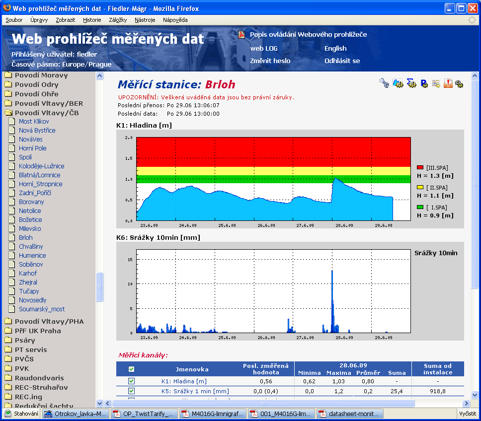 Water-level monitoring in the stream is closely connected with the intensity of rainfall. Telemetric stations M4016-G3 record water-level data and in the same time measure rainfalls. Water–level is monitored by one or two sensors and rainfall is measured by a shuttle rain gauge.